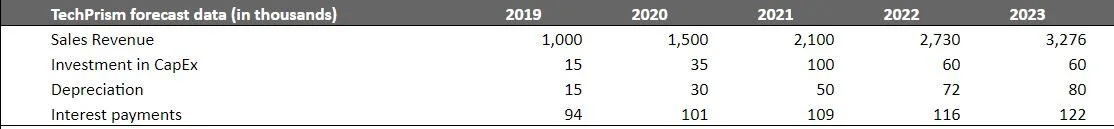 TechPrism has $1,475,000 (market value) of long-term debt. COGS are 20% of revenue in year 1. SG&A is 75% of revenue in 2019, and is expected to reduce to 63% by 2023. The corporate tax rate is 40%, its cost of borrowing is 6.2%, and it has a target debt to value ratio of 15%. The company has impressive revenue growth figures, showing 50% in year 1.