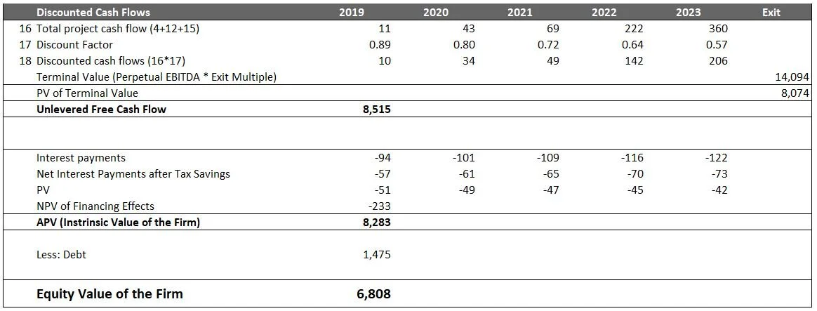 By adding together the impact of cash flows from capital investment, operations, and financing activities, we can calculate the present value by discounting the net cash flows based on the WACC calculated earlier. Each year’s relevant cash flows can be seen in Exhibit 2.