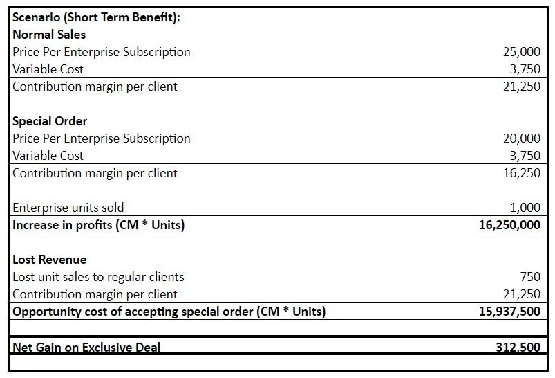 A financial analysis of the problem determines that the company will derive a net gain of $312,500 from accepting the special order, despite each special order unit having a significantly lower contribution margin. The net gain can also be referred to as opportunity cost. The opportunity cost of the estimated 750 lost clients does not exceed the contribution derived from the special order; therefore, management would be inclined to accept the order based on quantitative factors.