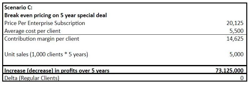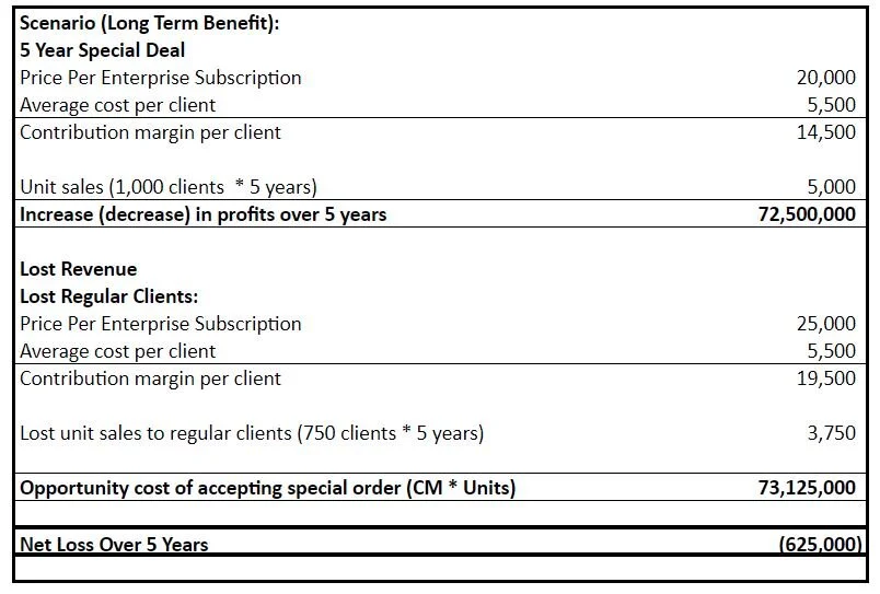 TechCo. sells B2B subscription software. The company’s leading platform is priced as $25,000 for an annual contract, and is utilized across many industries. It calculates the variable cost as $3,750 per client, and the average total cost per client is $5,500. An industry vertical co-op has offered to sign up 1,000 clients all at one time on TechCo.’s platform. In exchange for signing up all clients simultaneously, they are asking for a price per client of $20,000, along with exclusivity within the industry. This would bar some of the co-op’s competitors from utilizing the software. TechCo. must consider the lost revenue to other potential clients, in exchange for exclusivity.